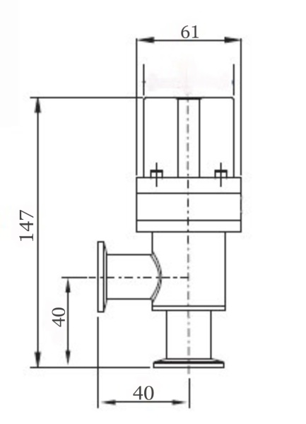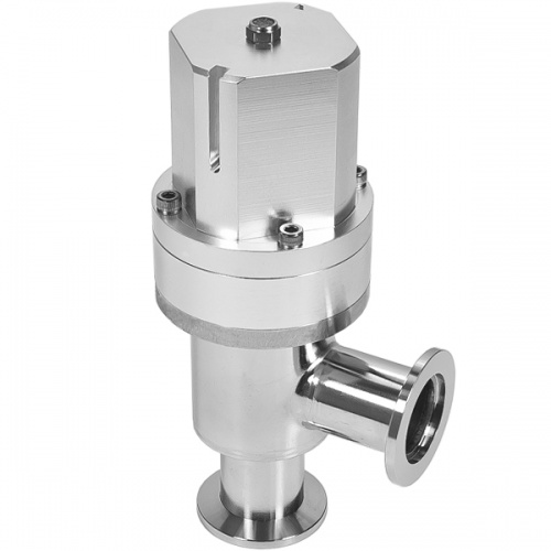 Пневматический угловой вакумный клапан с открытием сжатым воздухом, закрытием пружиной (нормально закрытый вакуумный клапан), витоновое уплотнение корпуса. Сильфонное уплотнение штока. Корпус – электрополированная нержавеющая сталь.
